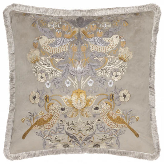 Morris & Co. Strawberry Thief Embroidered Velvet Cushion - Biscuit